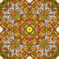 Een caleidoscopisch beeld in vier kwadranten met groen als hoofdkleur aangevuld met heldergele, roodbruine en lichtblauwe accenten, gebaseerd op een foto van de jonge blaadjes van een populier in het voorjaar.
