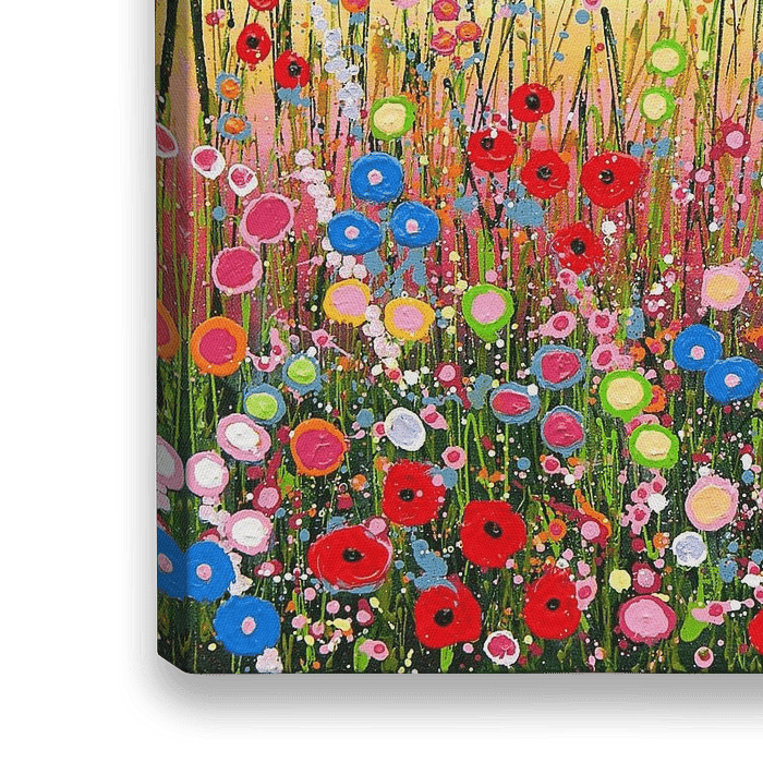 Prachtig en kleurrijk schilderij van een vrolijk bloemenveld met klaprozen, korenbloemen en andere bloemen. Abstract weergegeven. Handgeschilderd met acrylverf. Zorgvuldige kleurafstemming met een mooie zon in subtiele luchtschakering. Fine art en subtiel. Bloemenzee. Bloemen. Bloemenpracht. Veldbloemen. Passend bij diverse trends.…
