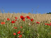 Het digitale kunstwerk “Poppies” toont een uitgestrekt veld vol klaprozen bij Saint-Valéry-sur-Somme, badend in het felle licht van een stralend blauwe, wolkenloze lucht. De rode bloemen deinen zacht mee in een lichte bries, hun tere blaadjes vormen een levendig contrast met het frisse groen van het gras. Aan de horizon rijzen bomen op, subtiel getekend met zachte penseelstreken.