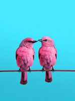 Een stel roze vogels op een draad, gepresenteerd in een kunststijl die speelse lichaamsmanipulaties omvat en een vachtachtige textuur oproept, vergelijkbaar met de beelden die je in National Geographic zou vinden. De kleuren van dit kunstwerk zijn geïnspireerd door de cyan-tonen van Flickr en bieden een uitzonderlijke ultrahoge definitie (UHD) beeldkwaliteit, met realistische vormen die tot leven komen.