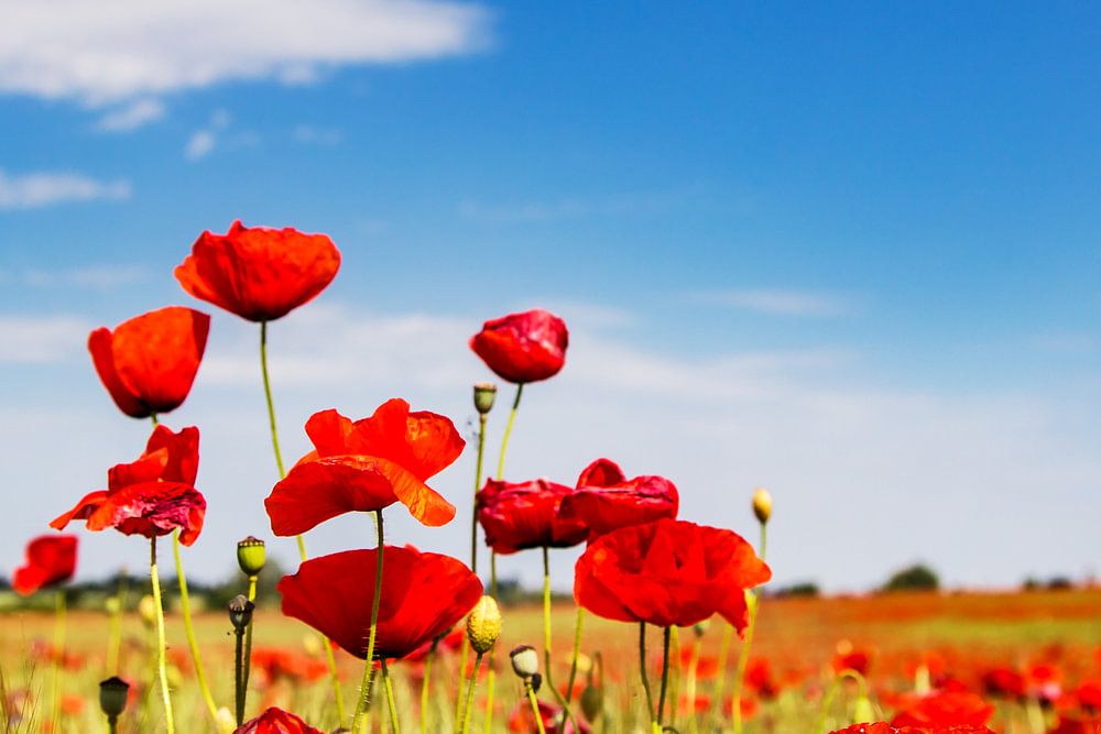 Roodbloeiende klaprozen aan de rand van een veld in de Uckermark.