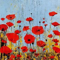Een veld van klaprozen, geschilderd met levendige rode en gele verf tegen een blauw met witte achtergrond, wat een frisse en heldere sfeer creëert. De rode bloemen, met hun zwarte kernen, steken sterk af tegen de lichtere achtergrond en geven een gevoel van diepte en beweging. De textuur lijkt ruw en expressief, met zichtbare…