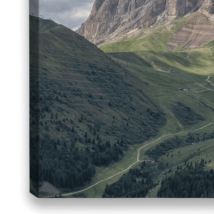 De Pordoipas op een half bewolkte dag in juli. Hij ligt in de Dolomieten, Italië. Hij wordt door veel wielrenners gebruikt om de klimbenen te trainen. Hij is ook opgenomen in de wielkoers de "Dolomieten Marathon"