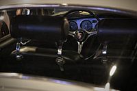 Blik door de achteruit van deze klassieke Porsche 356 tussen de voorstoelen door op dashboard en het stuurwiel met Porsche logo.