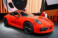 Porsche 911 Carrera 2 Coupé (992 Series) sportwagen in rood. De Porsche 992 is de achtste generatie van de Porsche 911 sportwagen en verkrijgbaar als coupé en cabriolet.