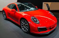 Rode Porsche 911 Carrera S sportwagen vooraanzicht. De 911 Carrera S is uitgerust met een 6 cilinder motor die 420 pk produceert.