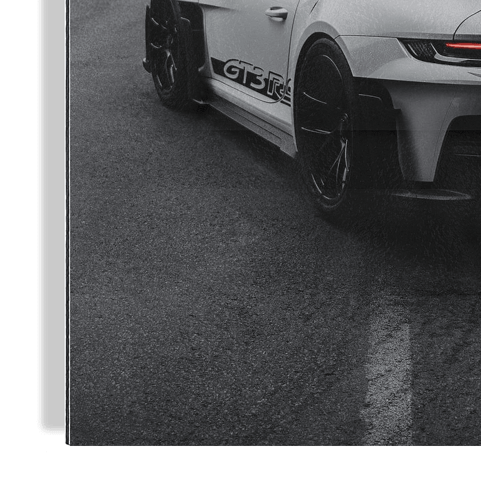 De krachtige Porsche 911 GT3 RS (992) rijdt over een eindeloze, stemmige snelweg. Een dramatisch, overwegend monochroom shot zet de agressieve achtervleugel en het gestroomlijnde ontwerp in de kijker tegen een bergachtige horizon.