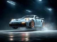 Een Porsche 911 GT2 uit 2024 zweeft licht in de lucht, gefotografeerd met een cinematische stijl. Professionele autografie, studioverlichting en een schone achtergrond zorgen voor een adembenemende reclamefoto. De hypergedetailleerde opname laat elk detail scherp zien. Een beeld dat je zeker aan de muur wilt hangen, volledig in…