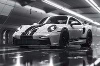 Op de zwart-wit foto staat een Porsche 911 GT2, die kracht en verfijning uitstraalt. De lage, brede carrosserie met uitgesproken wielkasten en gedurfde lijnen komt duidelijk naar voren. Grote luchtinlaten en een prominente achtervleugel benadrukken zijn race-inspiratie. De glanzende velgen en het Porsche-embleem glinsteren subtiel. Tegen een contrasterende achtergrond van een lege weg of een industriële omgeving, belichaamt deze auto snelheid, precisie en ongeëvenaarde prestaties in een tijdloos, monochroom beeld.