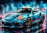 Dit aquarel neonschilderij vangt de Porsche 911 GT3 RS met levendige energie, waarbij vloeiende penseelstreken en gloeiende tinten worden gebruikt om de snelheid en vorm te benadrukken. De brede houding van de auto, de achtervleugel en de gebeeldhouwde lijnen schitteren in elektrische tinten. De GT3 RS wordt aangedreven door een 4.0L flat-six-motor met meer dan 500 pk en haalt 0-100 km/u in ongeveer 3 seconden. Het kunstwerk weerspiegelt zowel de aerodynamische schoonheid als de rauwe circuitprestaties in een gedurfde, expressieve stijl.