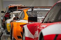 Line-up van raceautos waaronder de fel oranje gekleurde Porsche 911 GT3 R Hybrid in het Porsche museum in Stuttgart.