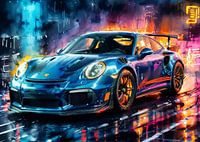 Dit diepe en expressieve neonwaterverfschilderij toont de Porsche 911 GT3 RS in maritiem blauw - een rijke, stemmige tint die doet denken aan diepten van de oceaan en middernachtelijke racebanen. De gloeiende accenten kabbelen door de aquarellagen en geven de auto een aura van mysterie en snelheid. Elke penseelstreek straalt beweging, passie en precisietechniek uit.