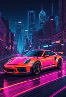 Dit kunstwerk verbeeldt de Porsche 911 GT3 RS in een gloeiende synthwavewereld, waar neonroosters zich uitstrekken over de horizon en retro-futuristische lichten de scène doen ontvlammen. Het silhouet van de auto steekt fel af tegen de achtergrond, de strakke lijnen worden versterkt door de lichtgevende energie van het op de jaren 80 geïnspireerde palet. Schilderachtige texturen versterken de metallic contouren en geven de indruk van snelheid bevroren in een elektrisch droomlandschap. Het resultaat is een werk dat zowel beweging als stilte vastlegt en de kijker onderdompelt in een filmische neonatmosfeer.