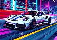 In de illustratie van de Porsche 911 GT3 RS scheurt de auto door een neonverlicht cyberpunk-stadslandschap. De auto met zijn iconische aerodynamische ontwerp vliegt langs gloeiende wolkenkrabbers en futuristische straten en laat een spoor van licht achter. De levendige neonkleuren contrasteren met de strakke, agressieve lijnen van de GT3 RS en benadrukken de prestaties en precisie in een hightech, elektriserende omgeving.