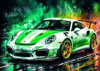 Dit verfrissende neon aquarel kunstwerk toont de Porsche 911 GT3 RS in helder wit, versierd met krachtige groene accenten die de compositie met pittige energie doorsnijden. De strakke witte basis straalt rust en precisie uit, terwijl het groen een pittig, prestatiegericht randje toevoegt. Spatten en sporen van neonkleuren creëren een gevoel van snelle beweging en elegantie.