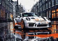 Een witte Porsche 911 GT3 RS met zwarte strepen scheurt zijdelings over een kruispunt in een Europese stad, gierende banden en opstijgende rook. De kasseien glinsteren van de recente regen en de vage stadslichten schijnen over het gepolijste oppervlak. Hij drift met gratie en agressie - precisie ontmoet rebellie, moderne razernij losgelaten op oude wegen vol geschiedenis.