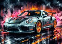 Dit aquarel neonschilderij vangt de Porsche 911 GT3 RS met levendige energie, waarbij vloeiende penseelstreken en gloeiende tinten worden gebruikt om de snelheid en vorm te benadrukken. De brede houding van de auto, de achtervleugel en de gebeeldhouwde lijnen schitteren in elektrische tinten. De GT3 RS wordt aangedreven door een 4.0L flat-six-motor met meer dan 500 pk en haalt 0-100 km/u in ongeveer 3 seconden. Het kunstwerk weerspiegelt zowel de aerodynamische schoonheid als de rauwe circuitprestaties in een gedurfde, expressieve stijl.