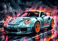 Dit aquarel neonschilderij vangt de Porsche 911 GT3 RS met levendige energie, waarbij vloeiende penseelstreken en gloeiende tinten worden gebruikt om de snelheid en vorm te benadrukken. De brede houding van de auto, de achtervleugel en de gebeeldhouwde lijnen schitteren in elektrische tinten. De GT3 RS wordt aangedreven door een 4.0L flat-six-motor met meer dan 500 pk en haalt 0-100 km/u in ongeveer 3 seconden. Het kunstwerk weerspiegelt zowel de aerodynamische schoonheid als de rauwe circuitprestaties in een gedurfde, expressieve stijl.