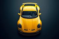 Een strakke, minimalistische poster met een egale, matte achtergrond in grijs zwart, zonder enige afleiding. In het midden domineert een Porsche 911 GT3 RS, gefotografeerd van boven, waardoor de perfecte symmetrie en de brede, gespierde heupen van de auto maximaal tot hun recht komen.