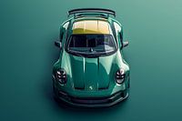 Een strakke, minimalistische poster met een egale, matte achtergrond in diep groen, zonder enige afleiding. In het midden domineert een Porsche 911 GT3 RS, gefotografeerd van boven, waardoor de perfecte symmetrie en de brede, gespierde heupen van de auto maximaal tot hun recht komen.