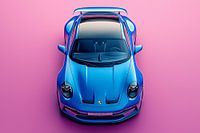 Een strakke, minimalistische poster met een egale, matte achtergrond in diep roze, zonder enige afleiding. In het midden domineert een Porsche 911 GT3 RS, gefotografeerd van boven, waardoor de perfecte symmetrie en de brede, gespierde heupen van de auto maximaal tot hun recht komen.