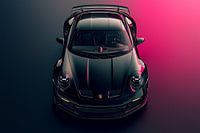 Een strakke, minimalistische poster met een egale, matte achtergrond in diep roze en zwart, zonder enige afleiding. In het midden domineert een Porsche 911 GT3 RS, gefotografeerd van boven, waardoor de perfecte symmetrie en de brede, gespierde heupen van de auto maximaal tot hun recht komen.