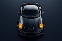 Een strakke, minimalistische poster met een egale, matte achtergrond in diep zwart, zonder enige afleiding. In het midden domineert een Porsche 911 GT3 RS, gefotografeerd van boven, waardoor de perfecte symmetrie en de brede, gespierde heupen van de auto maximaal tot hun recht komen.