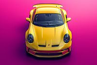 Een strakke, minimalistische poster met een egale, matte achtergrond in diep roze, zonder enige afleiding. In het midden domineert een Porsche 911 GT3 RS, gefotografeerd recht van boven, waardoor de perfecte symmetrie en de brede, gespierde heupen van de auto maximaal tot hun recht komen.