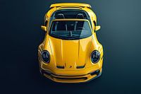 Een strakke, minimalistische poster met een egale, matte achtergrond in diep grijs, zonder enige afleiding. In het midden domineert een Porsche 911 GT3 RS, gefotografeerd recht van boven, waardoor de perfecte symmetrie en de brede, gespierde heupen van de auto maximaal tot hun recht komen.