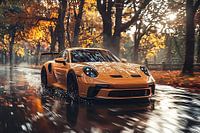 Een Porsche 911 GT3 rijdt soepel door een schilderachtig herfstlandschap, omringd door goudgele, oranje en roestrode bladeren die zachtjes van de bomen vallen. De glanzende lak van de auto weerspiegelt de warme herfstkleuren, terwijl de krachtige motor brult en de GT3 moeiteloos door bochtige, met bladeren bedekte wegen scheurt. De frisse herfstlucht en het adembenemende uitzicht benadrukken het gevoel van vrijheid en snelheid.