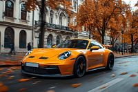 Een Porsche 911 GT3 rijdt soepel door een schilderachtig herfstlandschap, omringd door goudgele, oranje en roestrode bladeren die zachtjes van de bomen vallen. De glanzende lak van de auto weerspiegelt de warme herfstkleuren, terwijl de krachtige motor brult en de GT3 moeiteloos door bochtige, met bladeren bedekte wegen scheurt. De frisse herfstlucht en het adembenemende uitzicht benadrukken het gevoel van vrijheid en snelheid.