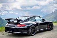 Porsche 911 GT3 sportwagen (generatie 997) in zwart met rode remklauwen tegen een berglandschap in de Alpen.