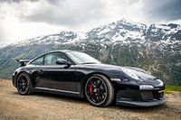 Porsche 911 GT3 sportwagen (generatie 997) in zwart met rode remklauwen tegen een berglandschap in de Alpen. De Porsche 911 GT3 (997) is een high-performance versie van de 911 GT3.