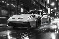 Op de zwart-wit foto straalt een Porsche 911 GT3 pure kracht en elegantie uit. De gestroomlijnde carrosserie, met zijn agressieve lijnen en aerodynamische vormen, komt scherp naar voren. De grote achtervleugel en brede luchtinlaten benadrukken zijn sportieve aard. De glimmende velgen en het iconische Porsche-embleem voegen een vleugje…