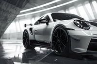 Op de zwart-wit foto straalt een Porsche 911 GT3 pure kracht en elegantie uit. De gestroomlijnde carrosserie, met zijn agressieve lijnen en aerodynamische vormen, komt scherp naar voren. De grote achtervleugel en brede luchtinlaten benadrukken zijn sportieve aard. De glimmende velgen en het iconische Porsche-embleem voegen een vleugje luxe toe. Tegen de contrasterende achtergrond van een lege weg of racetrack, belichaamt de auto snelheid en precisie in een tijdloos beeld.