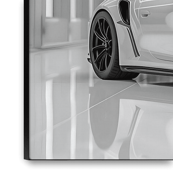 Op de zwart-wit foto straalt een Porsche 911 GT3 pure kracht en elegantie uit. De gestroomlijnde carrosserie, met zijn agressieve lijnen en aerodynamische vormen, komt scherp naar voren. De grote achtervleugel en brede luchtinlaten benadrukken zijn sportieve aard. De glimmende velgen en het iconische Porsche-embleem voegen een vleugje…