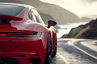 Een Porsche 911 GT3 snelt door het uitgestrekte Amerikaanse landschap, langs de eindeloze rechte wegen van de woestijn in het zuidwesten, waar rode rotsformaties en cactussen de horizon domineren. De glimmende sportwagen trekt stof op terwijl hij door verlaten highways scheurt, met zijn motor die diep en krachtig brult. Onder de open hemel, waar de zon laag aan de horizon staat, contrasteert de moderne schoonheid van de GT3 perfect met het ruige, wilde landschap van Amerika.