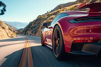 Een Porsche 911 GT3 snelt door het uitgestrekte Amerikaanse landschap, langs de eindeloze rechte wegen van de woestijn in het zuidwesten, waar rode rotsformaties en cactussen de horizon domineren. De glimmende sportwagen trekt stof op terwijl hij door verlaten highways scheurt, met zijn motor die diep en krachtig brult. Onder de open hemel, waar de zon laag aan de horizon staat, contrasteert de moderne schoonheid van de GT3 perfect met het ruige, wilde landschap van Amerika.