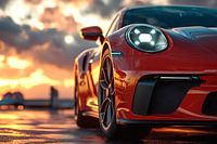 Een Porsche 911 GT3 snelt door het uitgestrekte Amerikaanse landschap, langs de eindeloze rechte wegen van de woestijn in het zuidwesten, waar rode rotsformaties en cactussen de horizon domineren. De glimmende sportwagen trekt stof op terwijl hij door verlaten highways scheurt, met zijn motor die diep en krachtig brult. Onder de open hemel, waar de zon laag aan de horizon staat, contrasteert de moderne schoonheid van de GT3 perfect met het ruige, wilde landschap van Amerika.
