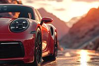 Een Porsche 911 GT3 snelt door het uitgestrekte Amerikaanse landschap, langs de eindeloze rechte wegen van de woestijn in het zuidwesten, waar rode rotsformaties en cactussen de horizon domineren. De glimmende sportwagen trekt stof op terwijl hij door verlaten highways scheurt, met zijn motor die diep en krachtig brult. Onder de open hemel, waar de zon laag aan de horizon staat, contrasteert de moderne schoonheid van de GT3 perfect met het ruige, wilde landschap van Amerika.