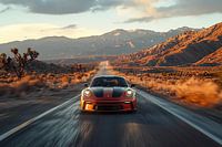 Een Porsche 911 GT3 snelt door het uitgestrekte Amerikaanse landschap, langs de eindeloze rechte wegen van de woestijn in het zuidwesten, waar rode rotsformaties en cactussen de horizon domineren. De glimmende sportwagen trekt stof op terwijl hij door verlaten highways scheurt, met zijn motor die diep en krachtig brult. Onder de open hemel, waar de zon laag aan de horizon staat, contrasteert de moderne schoonheid van de GT3 perfect met het ruige, wilde landschap van Amerika.