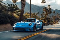 Een Porsche 911 GT3 snelt door het uitgestrekte Amerikaanse landschap, langs de eindeloze rechte wegen van de woestijn in het zuidwesten, waar rode rotsformaties en cactussen de horizon domineren. De glimmende sportwagen trekt stof op terwijl hij door verlaten highways scheurt, met zijn motor die diep en krachtig brult. Onder de open hemel, waar de zon laag aan de horizon staat, contrasteert de moderne schoonheid van de GT3 perfect met het ruige, wilde landschap van Amerika.