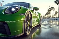 Een Porsche 911 GT3 snelt door het uitgestrekte Amerikaanse landschap, langs de eindeloze rechte wegen van de woestijn in het zuidwesten, waar rode rotsformaties en cactussen de horizon domineren. De glimmende sportwagen trekt stof op terwijl hij door verlaten highways scheurt, met zijn motor die diep en krachtig brult. Onder de open hemel, waar de zon laag aan de horizon staat, contrasteert de moderne schoonheid van de GT3 perfect met het ruige, wilde landschap van Amerika.