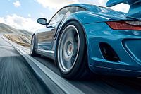 Een Porsche 911 GT3 snelt door het uitgestrekte Amerikaanse landschap, langs de eindeloze rechte wegen van de woestijn in het zuidwesten, waar rode rotsformaties en cactussen de horizon domineren. De glimmende sportwagen trekt stof op terwijl hij door verlaten highways scheurt, met zijn motor die diep en krachtig brult. Onder de open hemel, waar de zon laag aan de horizon staat, contrasteert de moderne schoonheid van de GT3 perfect met het ruige, wilde landschap van Amerika.
