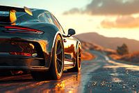 Een Porsche 911 GT3 snelt door het uitgestrekte Amerikaanse landschap, langs de eindeloze rechte wegen van de woestijn in het zuidwesten, waar rode rotsformaties en cactussen de horizon domineren. De glimmende sportwagen trekt stof op terwijl hij door verlaten highways scheurt, met zijn motor die diep en krachtig brult. Onder de open hemel, waar de zon laag aan de horizon staat, contrasteert de moderne schoonheid van de GT3 perfect met het ruige, wilde landschap van Amerika.