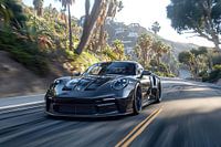 Een Porsche 911 GT3 snelt door het uitgestrekte Amerikaanse landschap, langs de eindeloze rechte wegen van de woestijn in het zuidwesten, waar rode rotsformaties en cactussen de horizon domineren. De glimmende sportwagen trekt stof op terwijl hij door verlaten highways scheurt, met zijn motor die diep en krachtig brult. Onder de open hemel, waar de zon laag aan de horizon staat, contrasteert de moderne schoonheid van de GT3 perfect met het ruige, wilde landschap van Amerika.