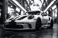 Een indrukwekkende poster van een witte Porsche 911 GT3, strak en glanzend in helder daglicht. De focus ligt op de elegante lijnen en krachtige details van de auto, met een lichte close-up die de schoonheid van de aerodynamische vormen benadrukt. Minimalistische achtergrond laat de GT3 volledig stralen, een pure ode aan snelheid en design.