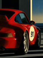 De foto toont een iconische Porsche 911 in felrood als een schilderij. Het karakteristieke silhouet met de onmiskenbare achterkant wordt benadrukt door het stijlvolle ronde 911 race-embleem op de zijkant. De rode lak schittert als vloeibaar vuur in het schilderachtige spel van licht en schaduw. De krachtige velgen en de aerodynamische…