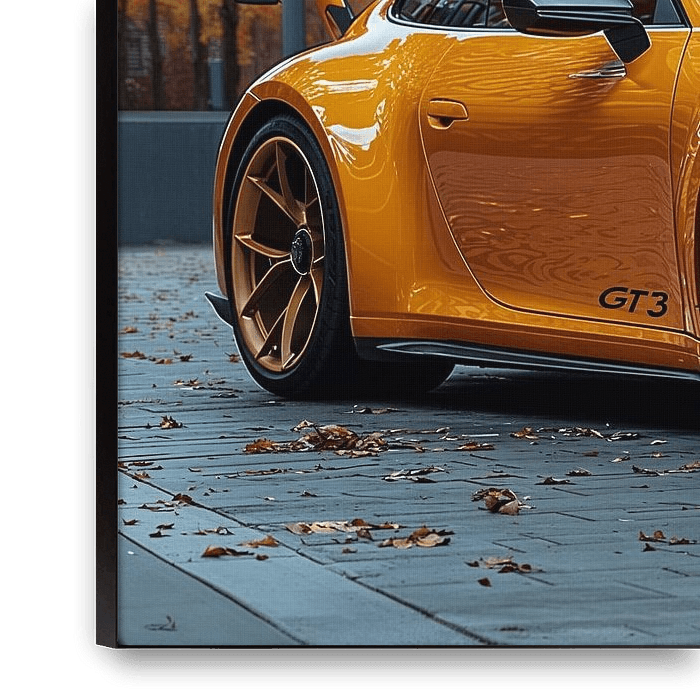 Een feloranje Porsche 911 staat in een brede stadsstraat, omringd door bomen in warme herfsttinten. De herfstkleuren harmoniëren perfect met de sportieve elegantie van de Porsche.
