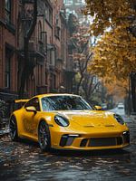 Op een bewolkte, regenachtige dag staat een knalgele Porsche 911 geparkeerd in een straat van NY city, omringd door bomen met felgekleurde herfstbladeren. Herfstbladeren, doorweekt door de regen kleven aan het asfalt.